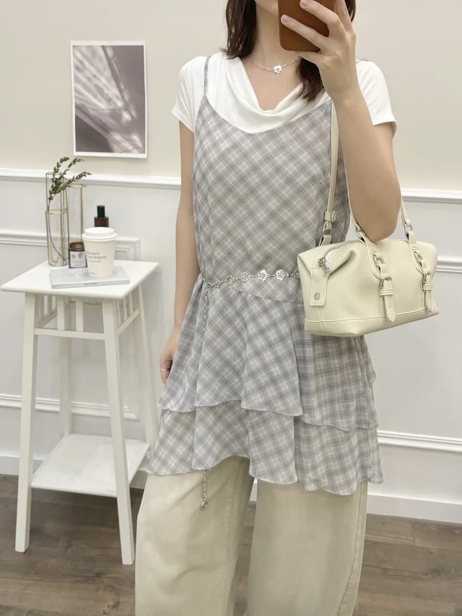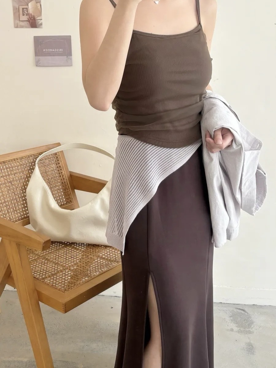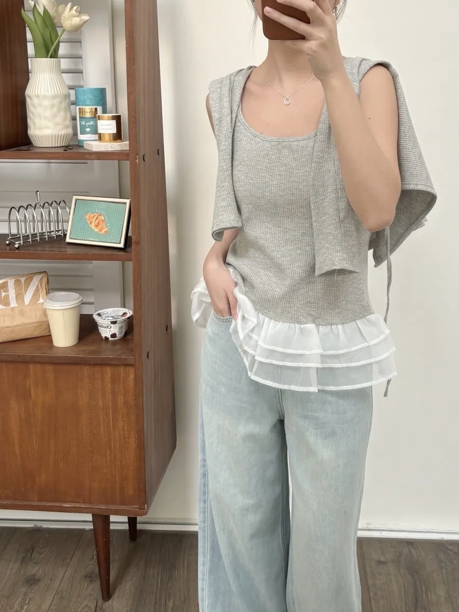 下擺拼接細肩帶背心+外罩兩件套