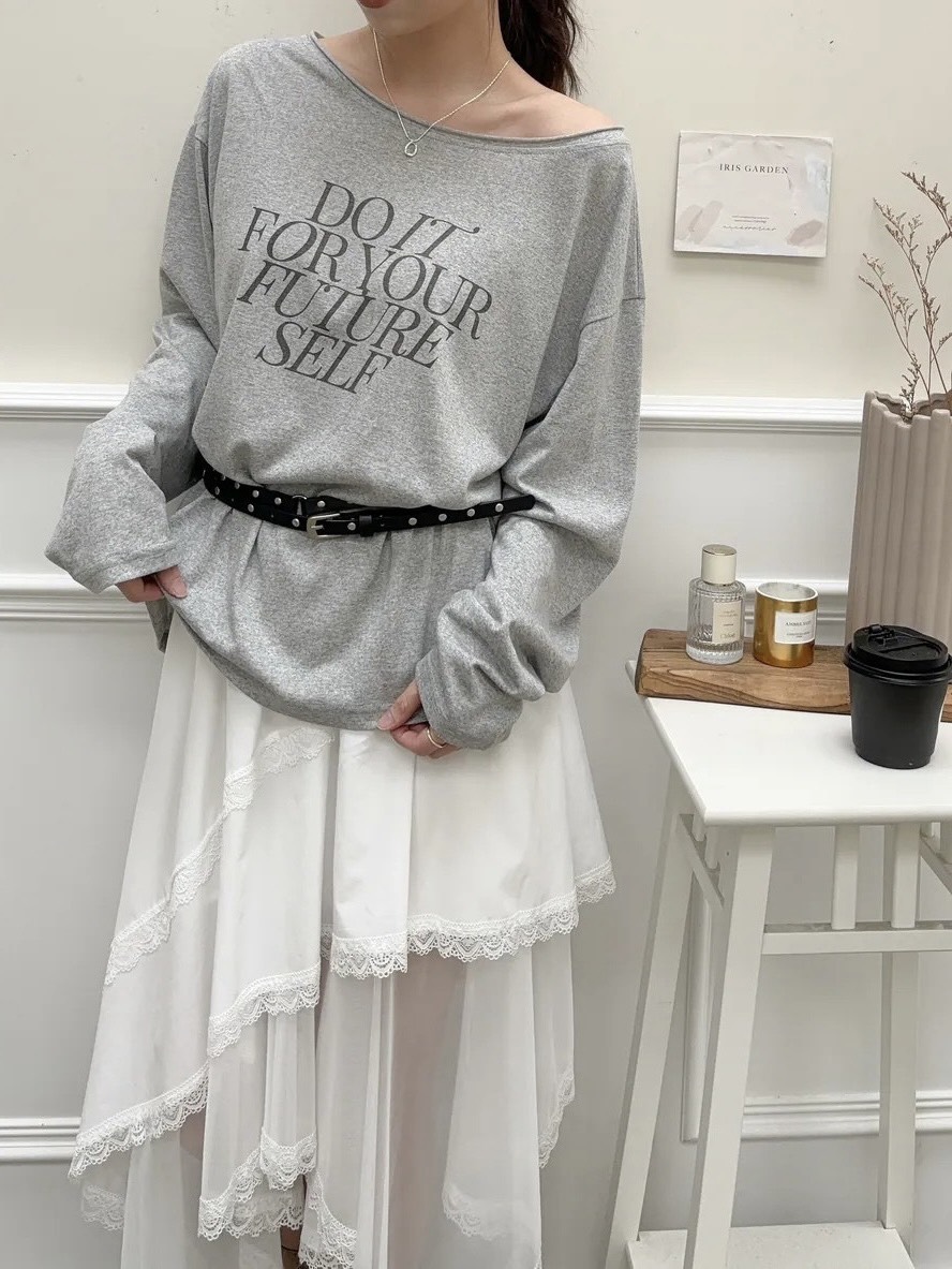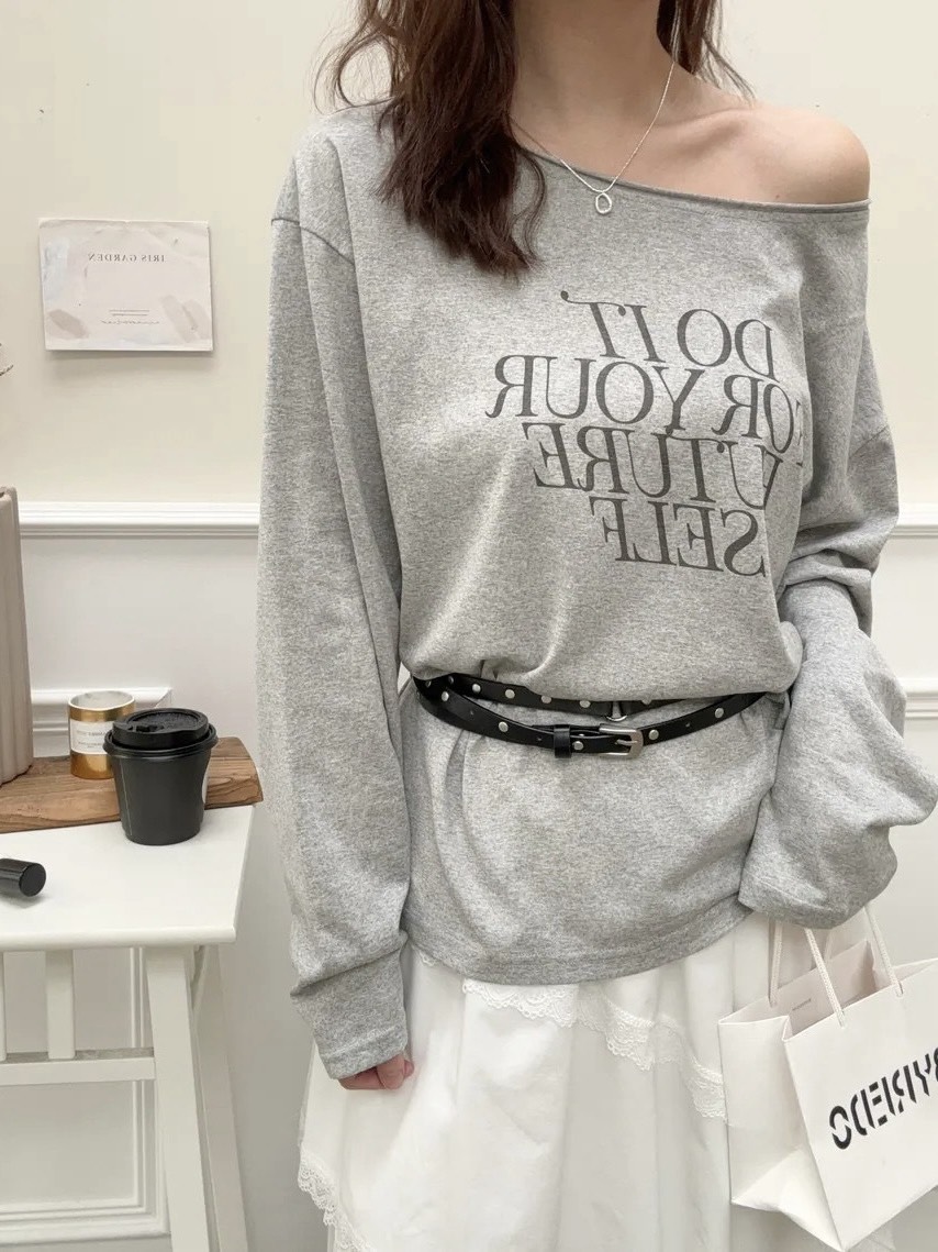 透膚英文斜肩上衣