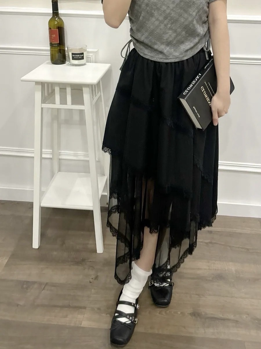 不規則拼接網紗鬆緊裙