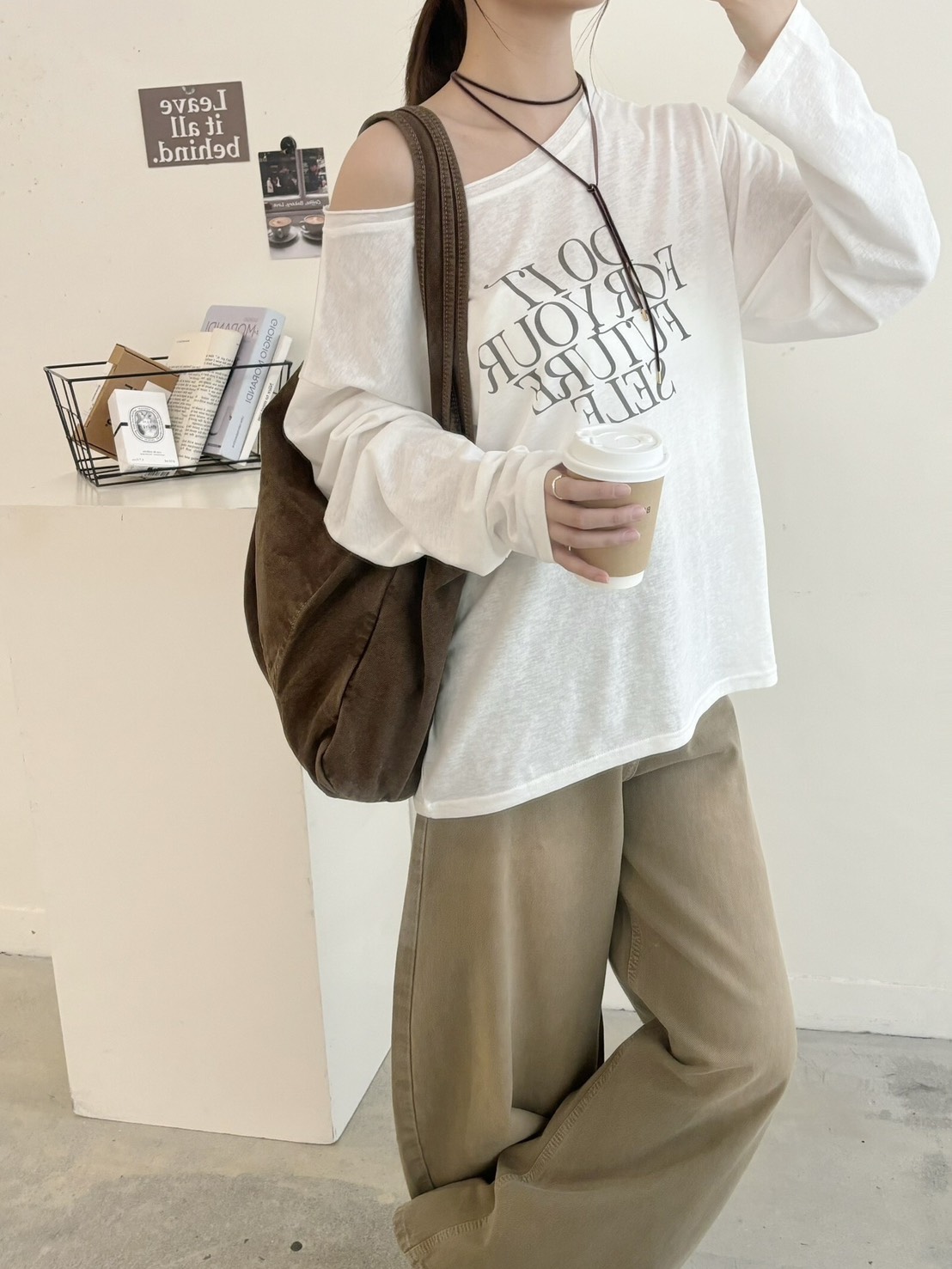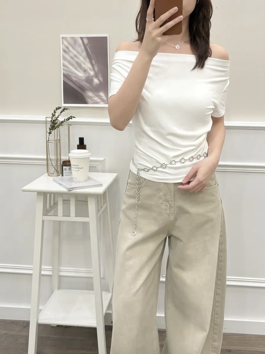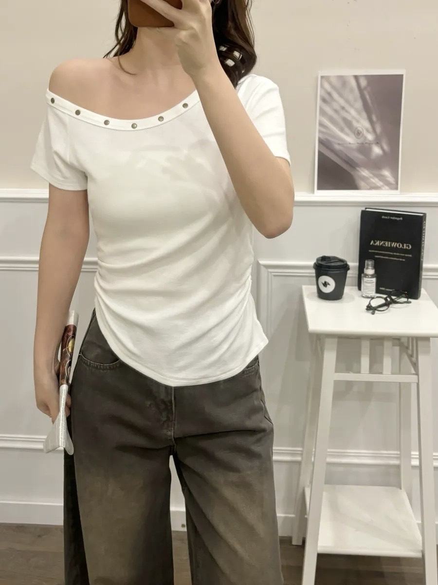 鉚釘斜肩收腰上衣