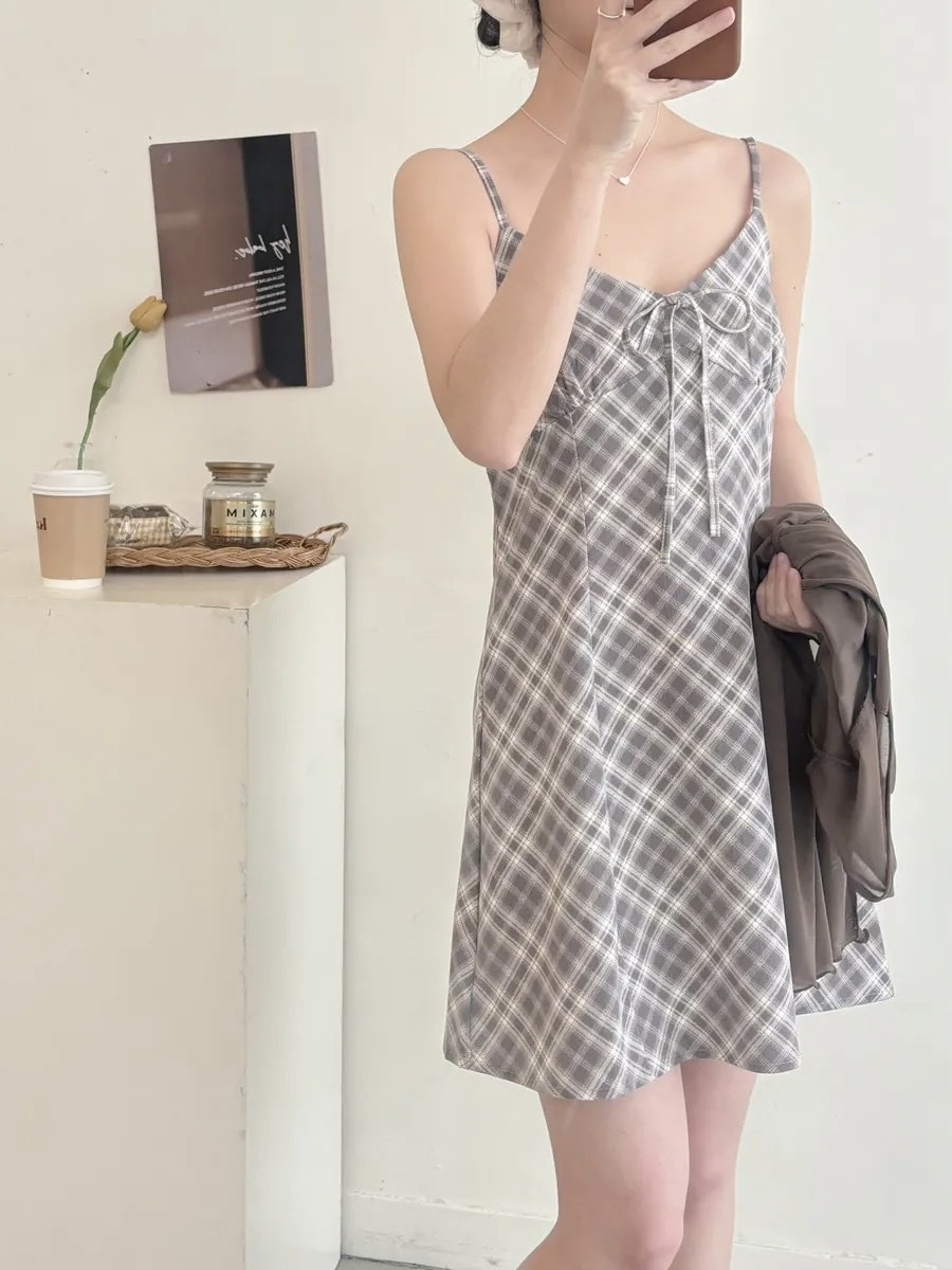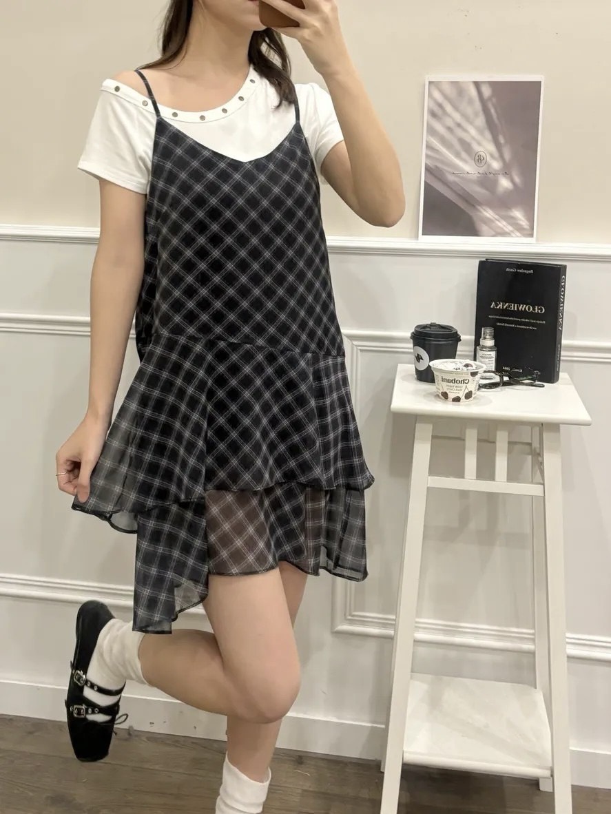 清新格子細肩短洋